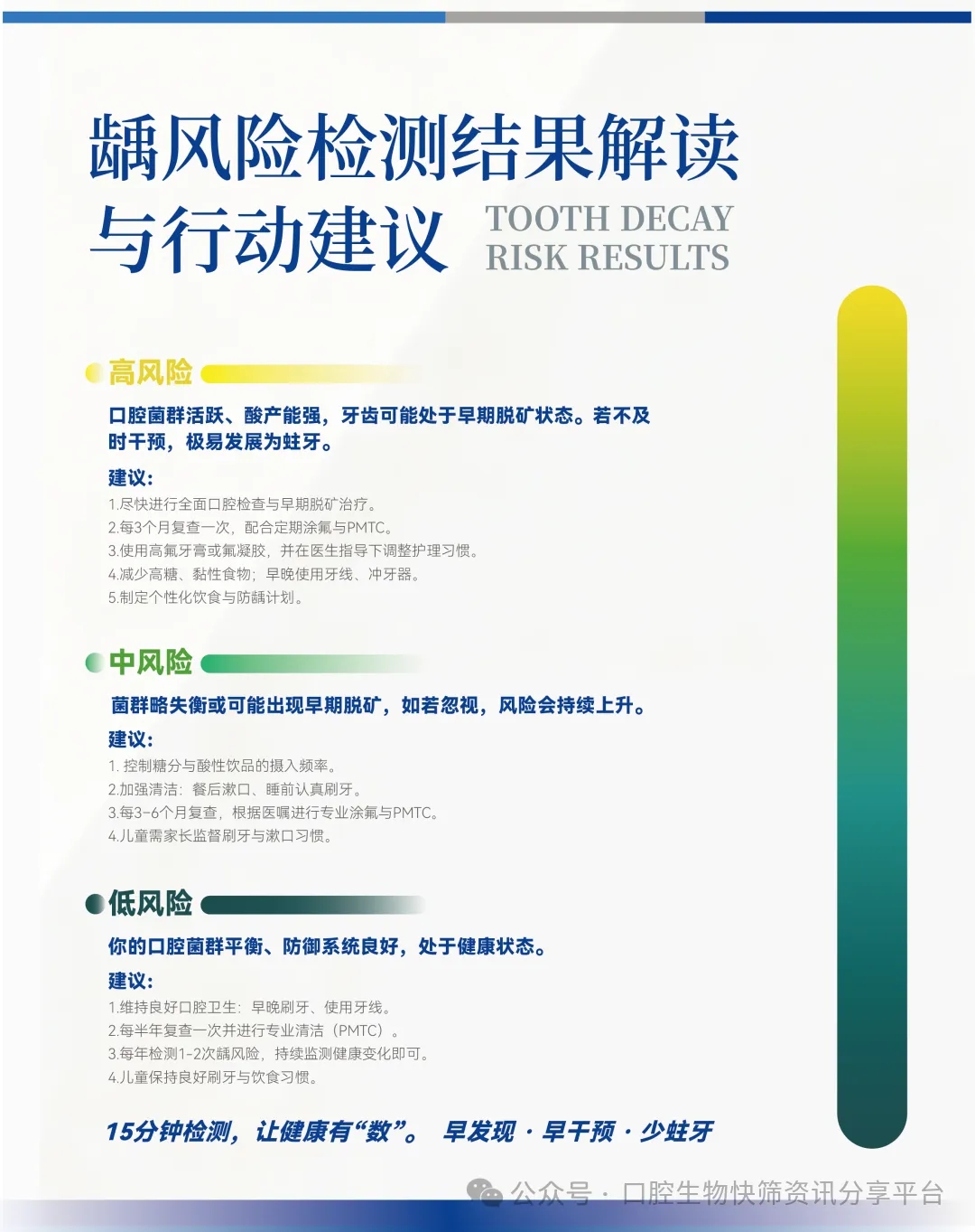 这种基于代谢趋势与风险结构的评估方式,使龋的管理不再停留在“是否已经发生”,而是更贴近疾病形成过程本身,为医生提供了一个理解口腔长期变化轨迹的科学工具,也为患者建立连续性的口腔健康管理奠定基础。